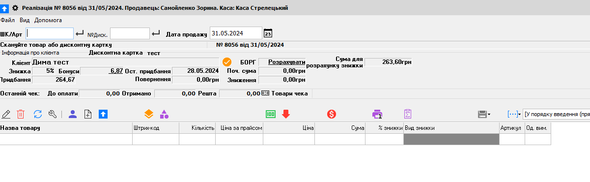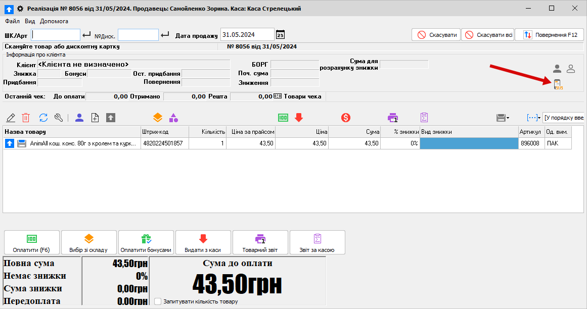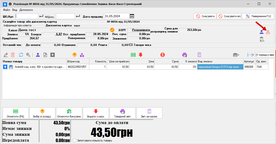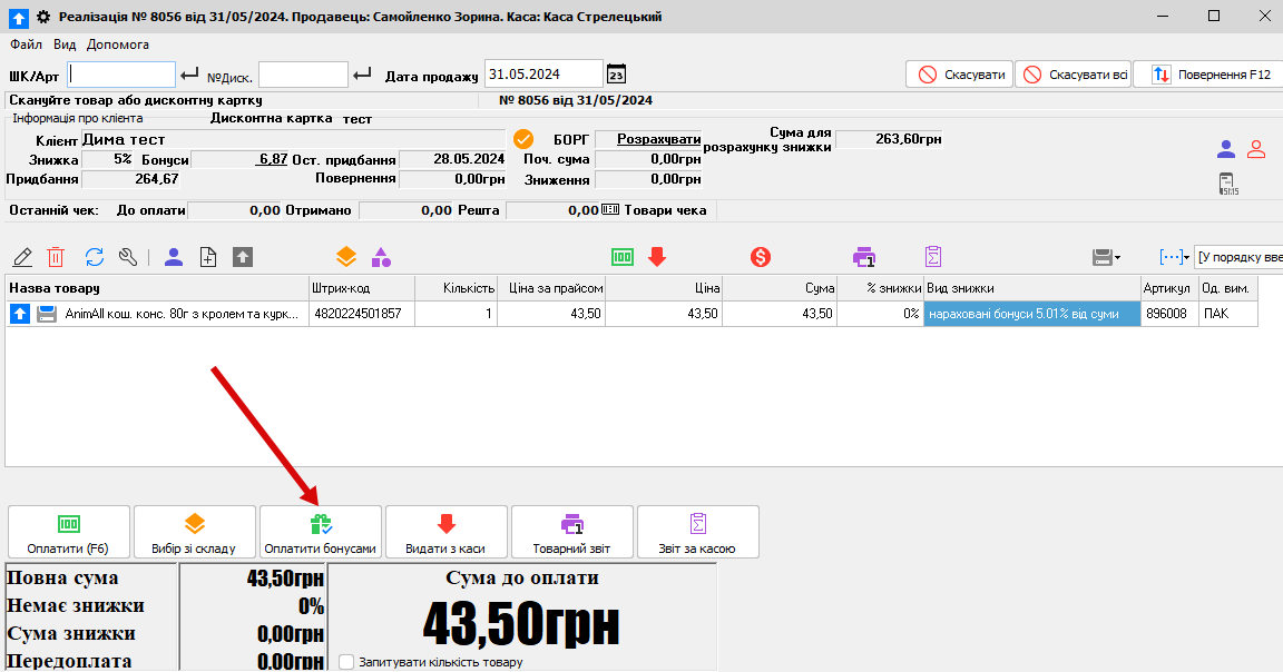 Потім пробиваємо товар, все звичайно (на рис. нижче показано де показується кількість бонусів саме цього клієнта