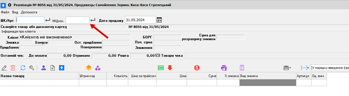 Для того щоб списати бонуси спочатку вводимо номер телефону у вікно "№Диск."