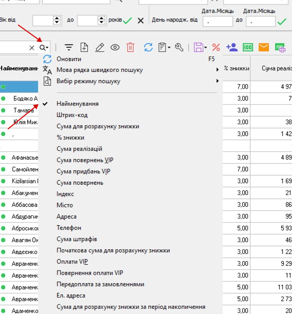 Для того, щоб знайти клієнта по прізвищу, необхідно у пошуку вибрати "Найменування" і ввести прізвище клієнта