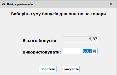 З'являється таке вікно, де показано скільки бонусів є у клієнта, і скільки ми списуємо
